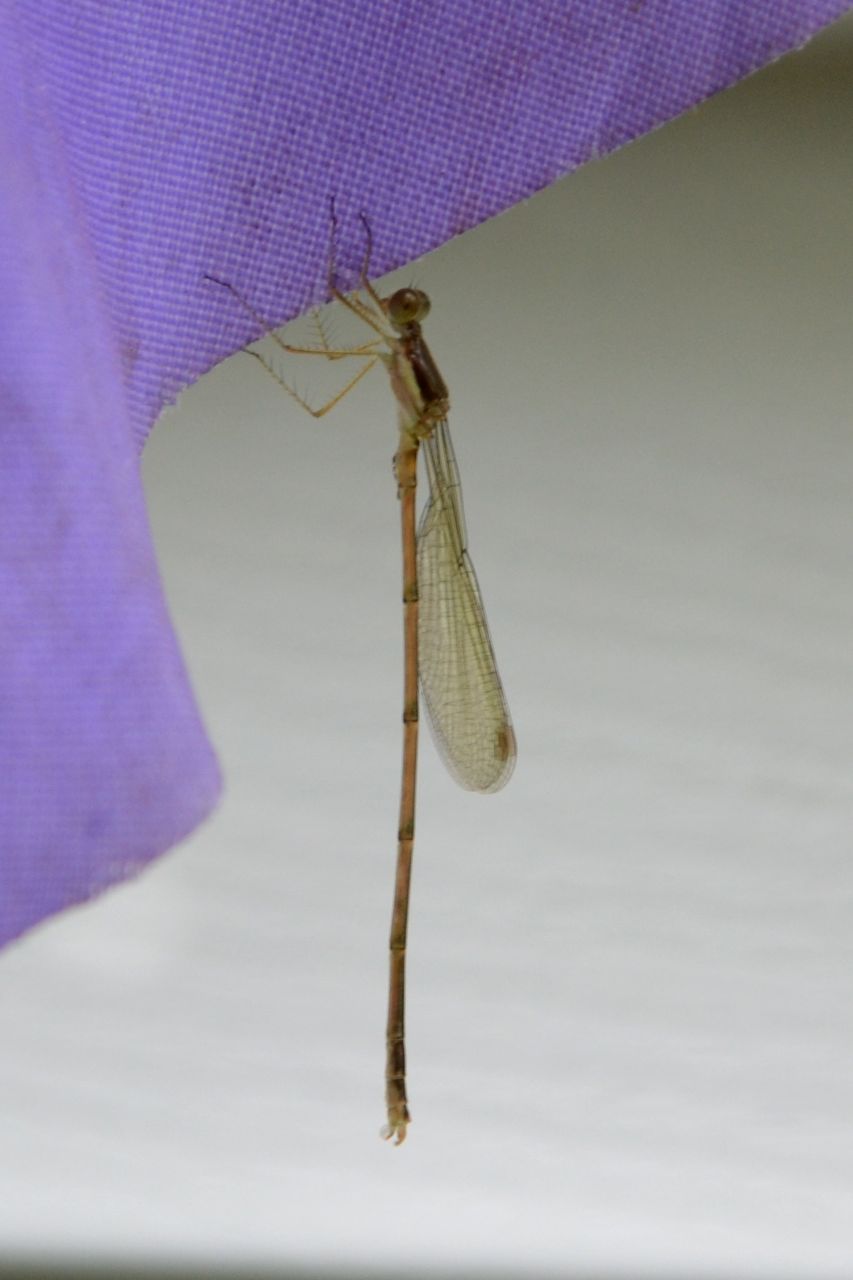 After spending an hour sitting on the doorsill watching the one nymph, I happened to glance over and down alongside the back of one of the flower pots. An older damsel had been hardening about a foot away from me the entire time. It didn't like a camera lens staring at it and while it was still "incomplete"--no color to speak of--it was able to fly. And did. Sorry, little one! Be safe.